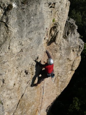 Ostres, només de veure el trànsit que hi ha en acostar-me a Barcelona un dilluns al matí ja em poso malalt... quasi ni ho recordava. Amb puntualitat britànica (raro, raro....) tirem cap a la paret bucòlica. Anem en horari de no passar fred, així que a les 12 som a peu de via, amb un bon solet i només emprenya la mica de vent que fa. Un sol cotxe al pàrking i vés per on, cordada a la mateixa via.. cap problema, esperem que tirin amunt i ens hi posem. Fa un bon solet i bona temperatura, llàstima del vent, que ens fa agafar més roba de la que cal per si de cas.